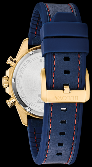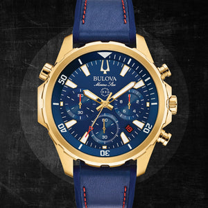 De la collection Marine Star. Chronographe à six aiguilles avec calendrier en IP noir et acier inoxydable doré avec cadran noir, verre minéral plat, boîtier à visser, bracelet en silicone bleu avec fermeture à boucle en 3 parties.