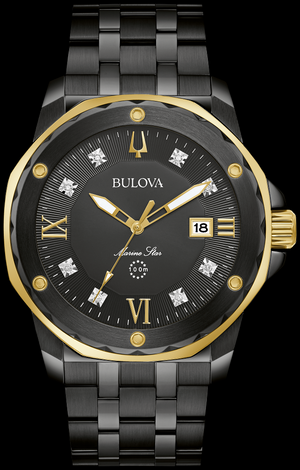 De la collection Marine Star. Chronographe à six aiguilles avec calendrier en IP noir et acier inoxydable doré avec cadran noir, verre minéral plat, boîtier à visser.