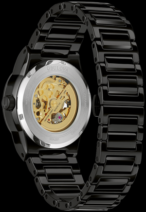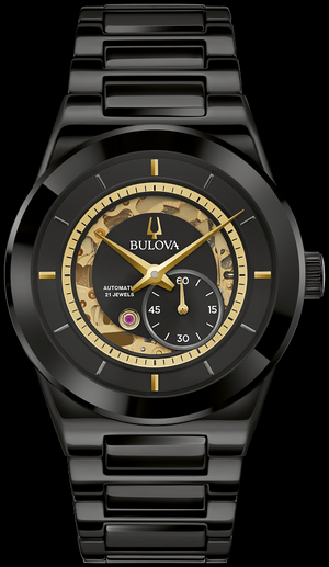 De la collection Modern Millennia, une nouvelle version d'une montre contemporaine qui fait une déclaration audacieuse. Le design élégant avec un boîtier et un bracelet en céramique noire présente un cadran noir à ouverture partielle et un cadran doré révélant le fonctionnement complexe du mouvement automatique à 21 rubis et est fini avec un cristal bombé bord à bord. Également dotée d'une boucle déployante à double pression et d'une étanchéité à 30 mètres, cette montre est idéale pour l'homme moderne au style individuel distinctif.