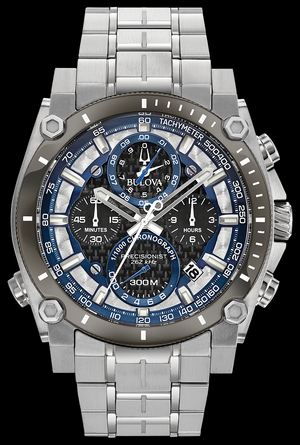 Alimenté par le mouvement chronographe à quartz Precisionist à huit aiguilles exclusif de Bulova avec une fréquence de vibration de 262 kHz, huit fois supérieure à celle des montres standard, pour une précision inégalée. Boîtier vissé en acier inoxydable et IP gris avec couronne vissée, cadran chronographe en fibre de carbone noir avec fonction date, verre minéral incurvé, bracelet en acier inoxydable avec fermeture à boucle déployante, barre de sécurité et rallonge, et étanchéité à 300 mètres.