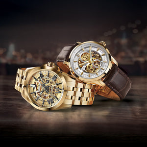 Design sophistiqué avec cadran et fond d'exposition complets. Boîtier à vis en acier inoxydable doré, cadran à trois aiguilles blanc squeletté et argent révélant les rouages complexes du mouvement à remontage automatique à 21 rubis, cristal minéral bombé, bracelet en cuir et résistance à l'eau à 30 mètres.