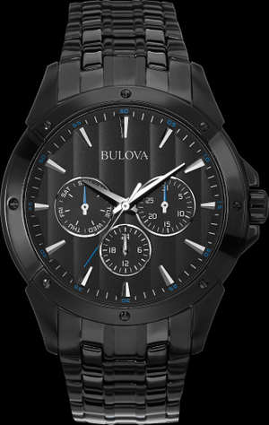 De la Collection Classique. Conception multifonction en acier inoxydable avec finition plaquée ionique noire, cadran noir à motifs, sous-cadrans jour, date et 24 heures, boîtier vissé et boucle déployante à double pression avec verrou de sécurité.