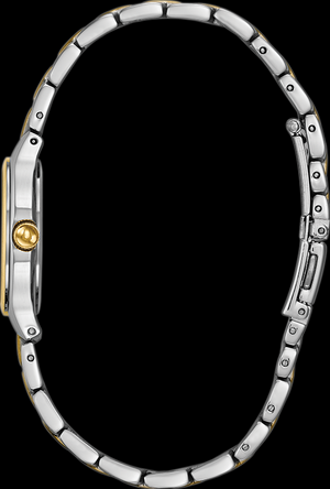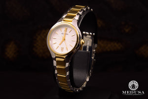 De la collection Classic. Boîtier en acier inoxydable au fini argenté et doré et cadran blanc argenté, verre minéral plat, mouvement analogique à trois aiguilles et fermeture à rabat.