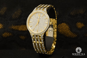 Nouveau style mince et élégant agrémenté de 636 cristaux Swarovski®. Boîtier et bracelet en acier inoxydable ton or et argent et cadran transparent. La montre est dotée d'un cristal minéral plat, d'un mouvement à quartz et d'une résistance à l'eau jusqu'à 30 mètres.