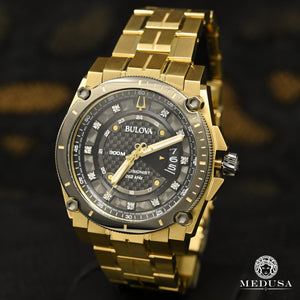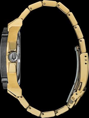 Propulsé par le mouvement de calendrier à trois aiguilles Precisionist exclusif à Bulova avec une fréquence de vibration de 262 kHz - huit fois supérieure à celle des garde-temps standard - pour une précision inégalée. Boîtier en acier inoxydable doré avec cadran noir avec 11 diamants sertis à la main, cristal minéral incurvé, bracelet en acier inoxydable doré avec boucle de style sport. Résistance à l'eau de 300 mètres.