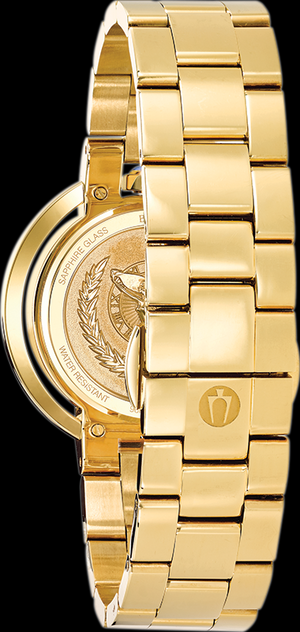 De la collection Rubaiyat. Héritage légendaire réinventé dans un boîtier en acier inoxydable doré avec une couronne cabochon en spinelle bleue synthétique positionnée à 12 heures et huit diamants individuellement sertis à la main sur un cadran blanc argenté texturé, une double glace saphir bombée, un bracelet en acier inoxydable doré avec déployant à double pression fermeture, colorant emblématique frappé Goddess of Time dos dimensionnel, et la résistance à l'eau à 30 mètres.