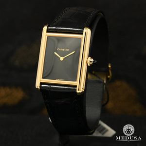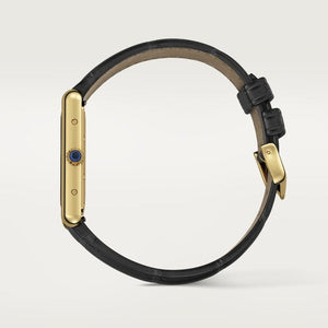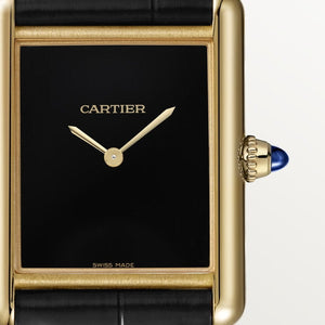Montre Tank Louis Cartier, grand modèle, mouvement mécanique Manufacture à remontage manuel. Boîte en or jaune 750/1000, couronne perlée ornée d'un saphir, cadran laque noire, aiguilles en forme de glaive en acier finition dorée, glace minérale, bracelet en alligator semi-mat noir, boucle ardillon en or jaune 750/1000. Taille de la boîte : 33,7 mm x 25,5 mm, épaisseur : 6,6 mm. Etanche jusqu'à 30 mètres.