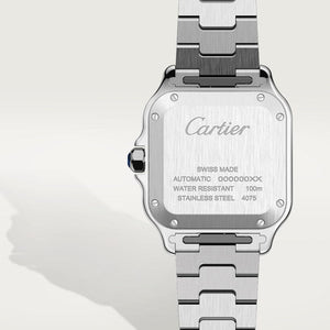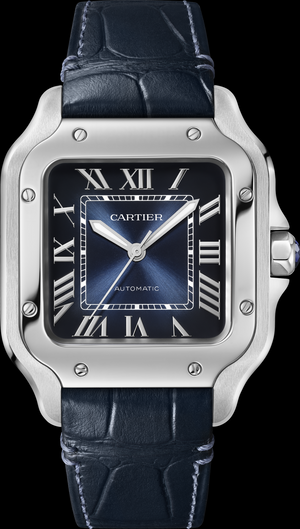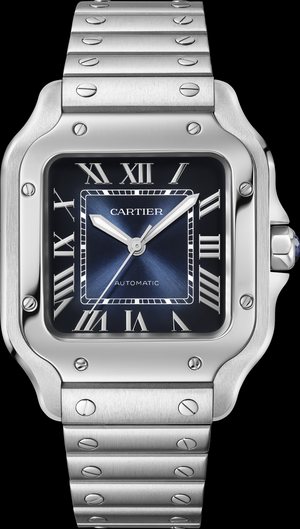 Montre Santos de Cartier, moyen modèle, mouvement mécanique à remontage automatique 1847 MC. Boîte en acier, couronne à 7 pans ornée d'un spinelle bleu de synthèse facetté, cadran bleu dégradé , aiguilles en forme de glaive en acier poli et matière luminescente , glace saphir. Bracelet acier avec système de mise à taille « Smartlink ». Deuxième bracelet en alligator bleu, avec boucle déployante interchangeable en acier. Les deux bracelets sont équipés du système d'interchangeabilité "QuickSwitch". Largeur de la boîte : 35,1 mm, épaisseur : 8,83 mm. Etanche jusqu'à 10 bars (~100 mètres).