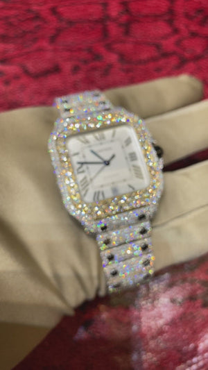 Montre Santos, grand modèle, mouvement mécanique à remontage automatique 1847 MC. Boîte en acier, couronne à 7 pans ornée d'un spinelle de synthèse facetté, cadran opalin argenté, aiguilles en forme de glaive en acier bleui, glace saphir. Bracelet acier avec système de mise à taille "SmartLink". Deuxième bracelet en veau, avec boucle déployante interchangeable en acier. Les deux bracelets sont équipés du système d'interchangeabilité "QuickSwitch". Largeur de la boîte : 39,8 mm, épaisseur : 9,08 mm. Etanche jusqu'à 10 bars (~100 mètres).