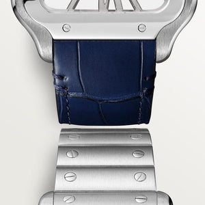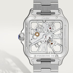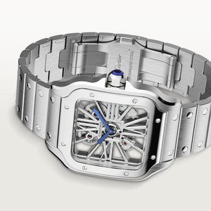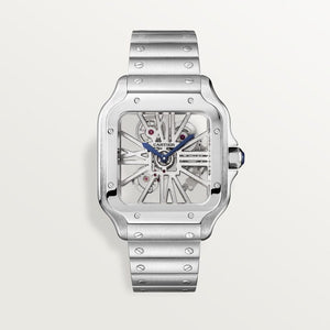 Montre Santos Squelette, grand modèle, mouvement mécanique manufacture à remontage manuel 9611 MC. Boîte en acier, couronne à 7 pans ornée d'un saphir facetté, aiguilles en forme de glaive en acier bleui, glace et fond saphir. Bracelet acier avec système de mise à taille "SmartLink". Deuxième bracelet en alligator, avec boucle déployante interchangeable en acier. Les deux bracelets sont équipés du système d'interchangeabilité "QuickSwitch". Heures, minutes avec squelettage des ponts en forme de chiffres romains. Mouvement individuellement numéroté et constitué de 138 pièces dont 20 rubis. Dimensions du mouvement : 28 mm x 28 mm, épaisseur du mouvement : 3,97 mm, balancier : 28'800 alternances/heure, réserve de marche d'environ 72 heures. Largeur de la boîte : 39,8 mm, épaisseur : 9,08 mm. Etanche à 10 bars (~100 mètres).