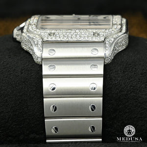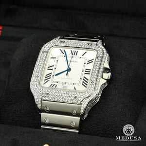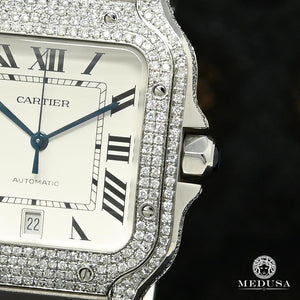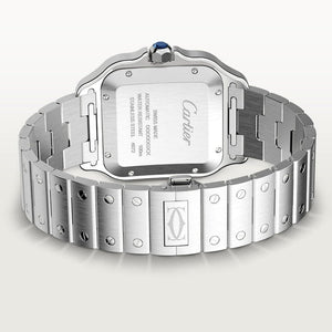 Montre Santos, grand modèle, mouvement mécanique à remontage automatique 1847 MC. Boîte en acier, couronne à 7 pans ornée d'un spinelle de synthèse facetté, cadran opalin argenté, aiguilles en forme de glaive en acier bleui, glace saphir. Bracelet acier avec système de mise à taille "SmartLink". Deuxième bracelet en veau, avec boucle déployante interchangeable en acier. Les deux bracelets sont équipés du système d'interchangeabilité "QuickSwitch". Largeur de la boîte : 39,8 mm, épaisseur : 9,08 mm. Etanche jusqu'à 10 bars (~100 mètres).