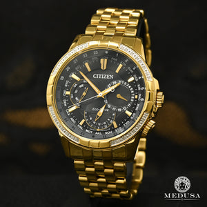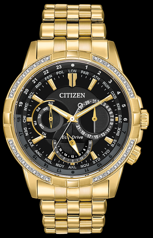Apportez de la sophistication à votre journée avec le Calendrier CITIZEN®. Cette montre intemporelle affiche l'heure mondiale dans 24 villes, l'heure 12/24 heures et le jour/date. Il est présenté ici dans un boîtier et un bracelet en acier inoxydable doré, avec une lunette ornée de diamants et un cadran noir. Doté de notre technologie Eco-Drive – alimenté par la lumière, n’importe quelle lumière. Jamais besoin de batterie.