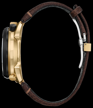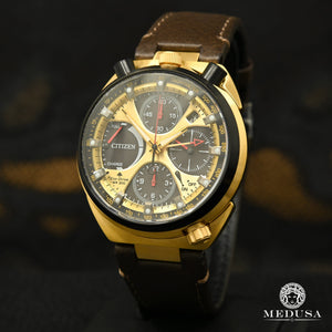 L’édition du 50ᵉ anniversaire de la Tsuno Chrono Racer Promaster est une montre de haute performance au design indéniablement distinctif. Inspiré par la montre Bullhead de Citizen originale de 1973, ce chronographe hors du commun est doté d’un boîtier en acier inoxydable bicolore de 45 mm tenu par un élégant bracelet en cuir marron. Doté d’un cadran doré, le design fait appel à quatre sous-cadrans noirs rehaussés par des aiguilles rouges pour créer un effet dynamique et sportif. Cette montre offre le mouvement assemblé à la main, un chronomètre au 1/5 de seconde avec fonction flyback qui peut mesurer jusqu’à 12 heures, une alarme, un compteur de réserve d’énergie et une fenêtre affichant la date. Fidèle aux normes de robustesse de la collection Promaster, cette montre est hydrorésistante jusqu’à 200 mètres. Dotée de la technologie exclusive Eco-Drive de Citizen, elle est alimentée par la lumière pour un fonctionnement constant et durable, sans pile. Numéro du calibre : E210.
