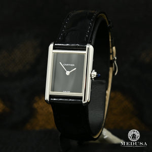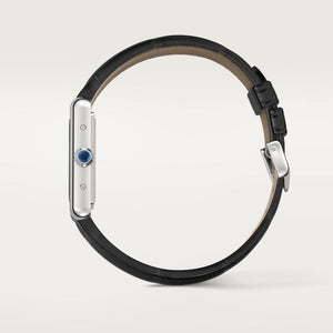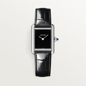 Montre Tank Must, petit modèle, mouvement à quartz. Boîte en acier, couronne perlée ornée d'un spinelle de synthèse en forme de cabochon, cadran laque noire, aiguilles en forme de glaive en acier rhodié, bracelet en alligator brillant noir, boucle ardillon en acier. Taille de la boîte : 29,5 x 22 mm, épaisseur : 6,6 mm. Etanche jusqu'à 3 bar (~30 mètres).