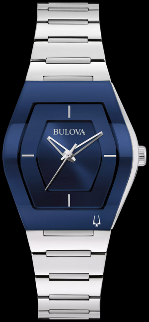 Boîtier en acier inoxydable de forme tonneau asymétrique distinctif avec une signature Futuro bleu bord à bord en cristal métallisé incurvé doté d'un cadran bleu et d'un bracelet en acier inoxydable. La montre dispose d'un mouvement à quartz à trois aiguilles, d'une boucle déployante avec poussoirs et d'une résistance à l'eau jusqu'à 30 mètres.