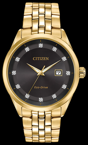 Cette montre de la collection Corso de CITIZEN® est rehaussée d'index en diamant vibrants et d'un verre saphir, dans une combinaison de simplicité fonctionnelle et d'une touche d'élégance. Grâce à la technologie Eco-Drive, c'est plus qu'une simple montre solaire, c'est une montre alimentée par n'importe quelle lumière. Présenté dans un boîtier et un bracelet en acier inoxydable doré avec un cadran et une date noirs.