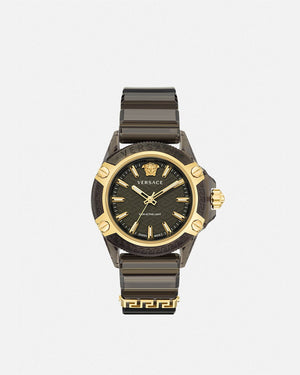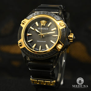 La montre Icon Active est une montre moderne et sportive avec des éléments transparents. Doté du logo Medusa et Versace à 12 heures, une boucle Greca accentue la bande métallique. Cette édition Indiglo présente un mouvement à 3 aiguilles et s'illumine dans l'obscurité.