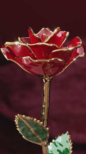 Chaque rose mesure 11-12 pouces de longueur et est livrée complète dans une boîte cadeau décorative incluant un magnifique trépied en acrylique transparent et une carte de authenticité attestant l'or 24K.