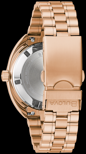 Cette nouvelle Bulova Oceanographer GMT pour hommes apporte un nouveau look et de nouvelles fonctionnalités au légendaire design Bulova. Le boîtier en acier inoxydable de couleur or rose présente une silhouette incurvée, un verre saphir, une lunette bidirectionnelle rotative bicolore « Root Beer » de 24 heures et une couronne vissée offrant une étanchéité de 200 m. Un cadran noir vif est accentué par des touches de couleur or rose de bon goût, avec des index luminescents appliqués, des aiguilles audacieuses, dont une aiguille de 24 heures et dotées d'une peinture luminescente, et un affichage de la date. Une aiguille des heures réglée indépendamment permet un réglage facile de l'heure locale. L'Océanographe GMT est animée par un mouvement GMT à remontage automatique doté de 24 rubis et d'une réserve de marche de 42 heures, protégé par un fond vissé. Associé à un bracelet à trois maillons assorti avec une boucle déployante sport. Où que vous alliez, quoi que vous fassiez, la Bulova Oceanographer GMT pour hommes veillera à ce que vous le fassiez avec style. Calibre : 9075